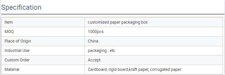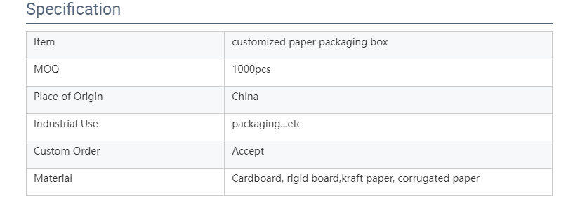 SpecificationItem customized paper packaging box MOQ 1pcs Place of Origin China Industrial Use packaging…etc Custom Order Accept Material Cardboard, rigid board,kraft paper, corrugated paper Why Choose Us