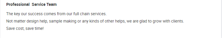 The key our success comes from our full chain services.Not matter design help, sample making or any kinds of other helps, we are glad to grow with clients.Save cost, save time!FAQ